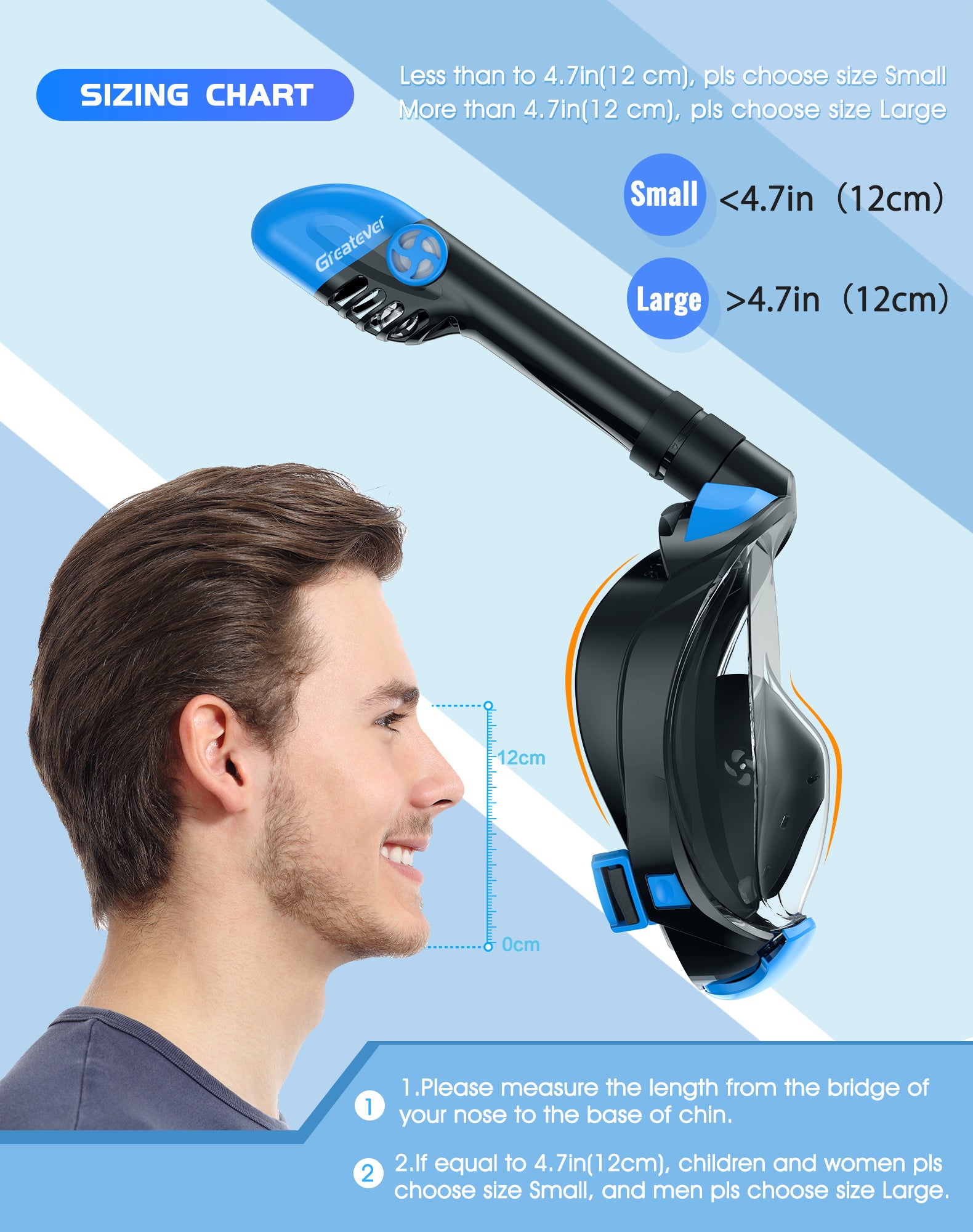 G2 Full face snorkel mask adjustable straps fit different face shape well, and high quality elastic straps also make you more comfortable to use, we can easily take it off in an emergency when snorkeling.