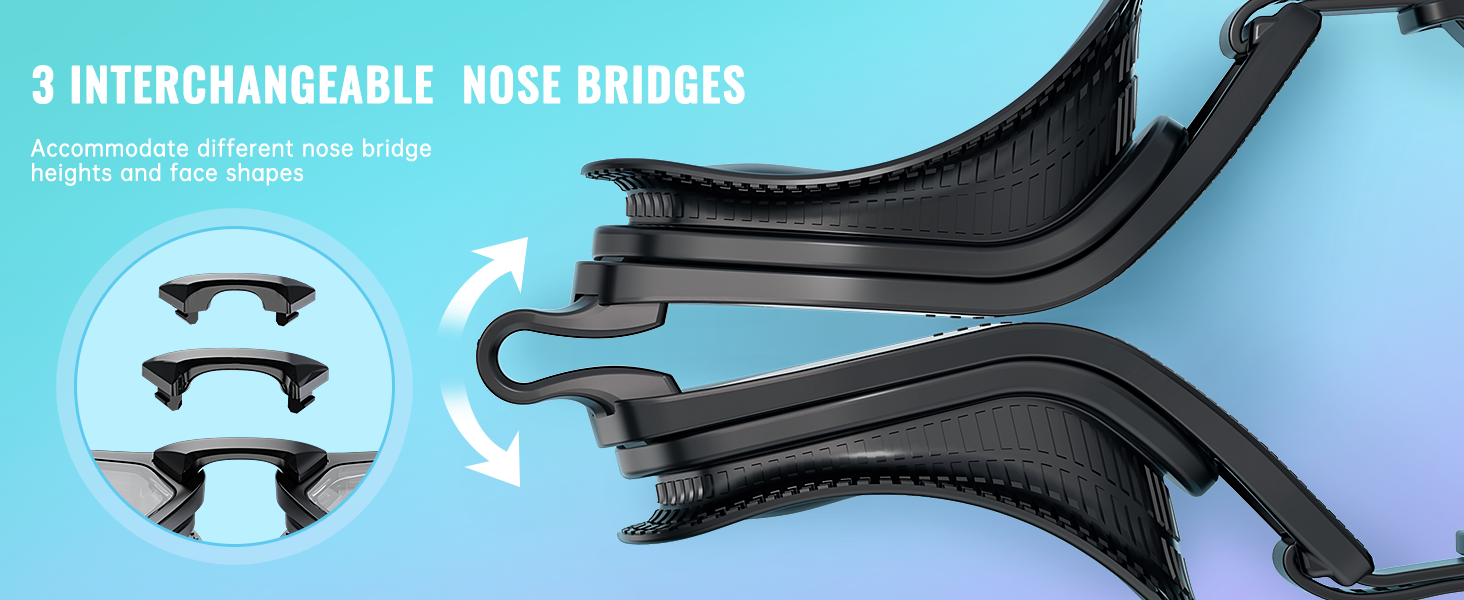 - 【Universal Comfort with Customizable Fit】Suitable for all face shapes, these swim goggles for adult women, men and teenagers feature an adjustable strap, ergonomic nose bridge, and three interchangeable nose pieces for a tailored, pressure-free fit.