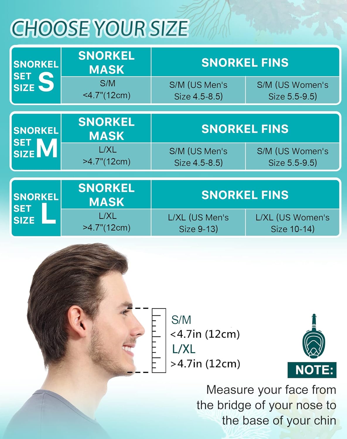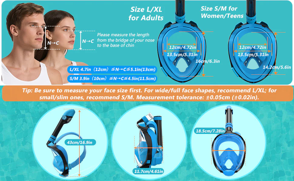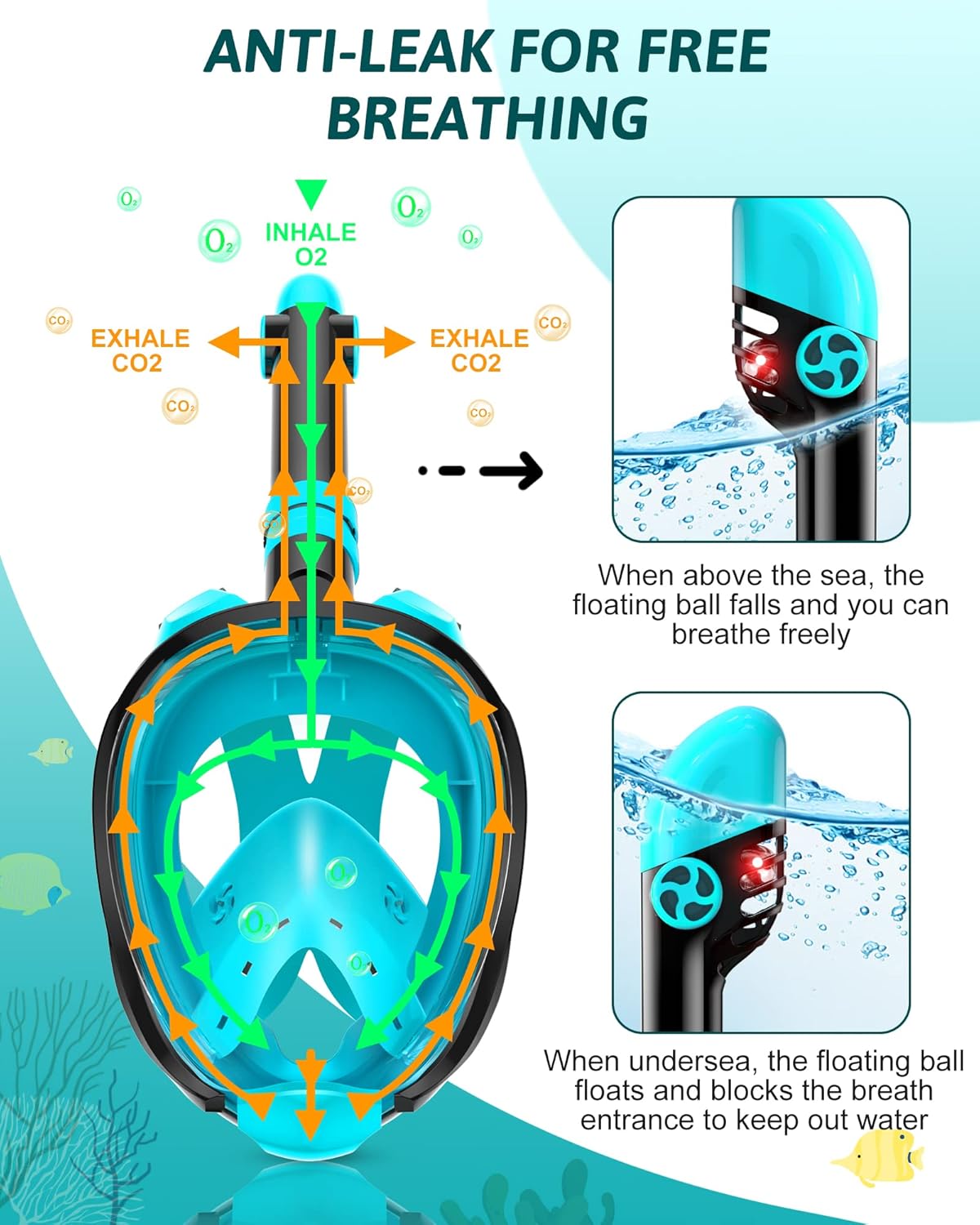 Our full face snorkel mask features clear, flat lenses that won't distort your view underwater, eliminating any dizziness or discomfort.