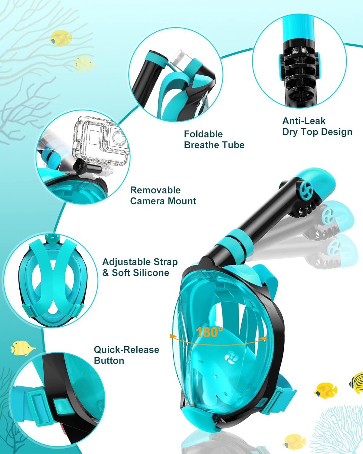 Foldable snorkel mask, easy to carry out without taking up space when traveling, assembly is very simple, a gentle twist can be installed.