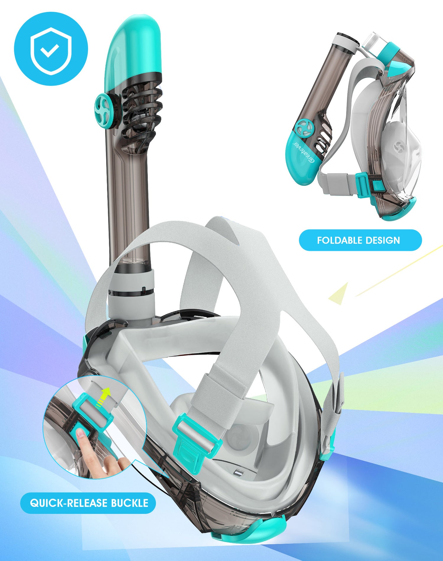 G2 Full face snorkel mask adjustable straps fit different face shape well, and high quality elastic straps also make you more comfortable to use, we can easily take it off in an emergency when snorkeling.
