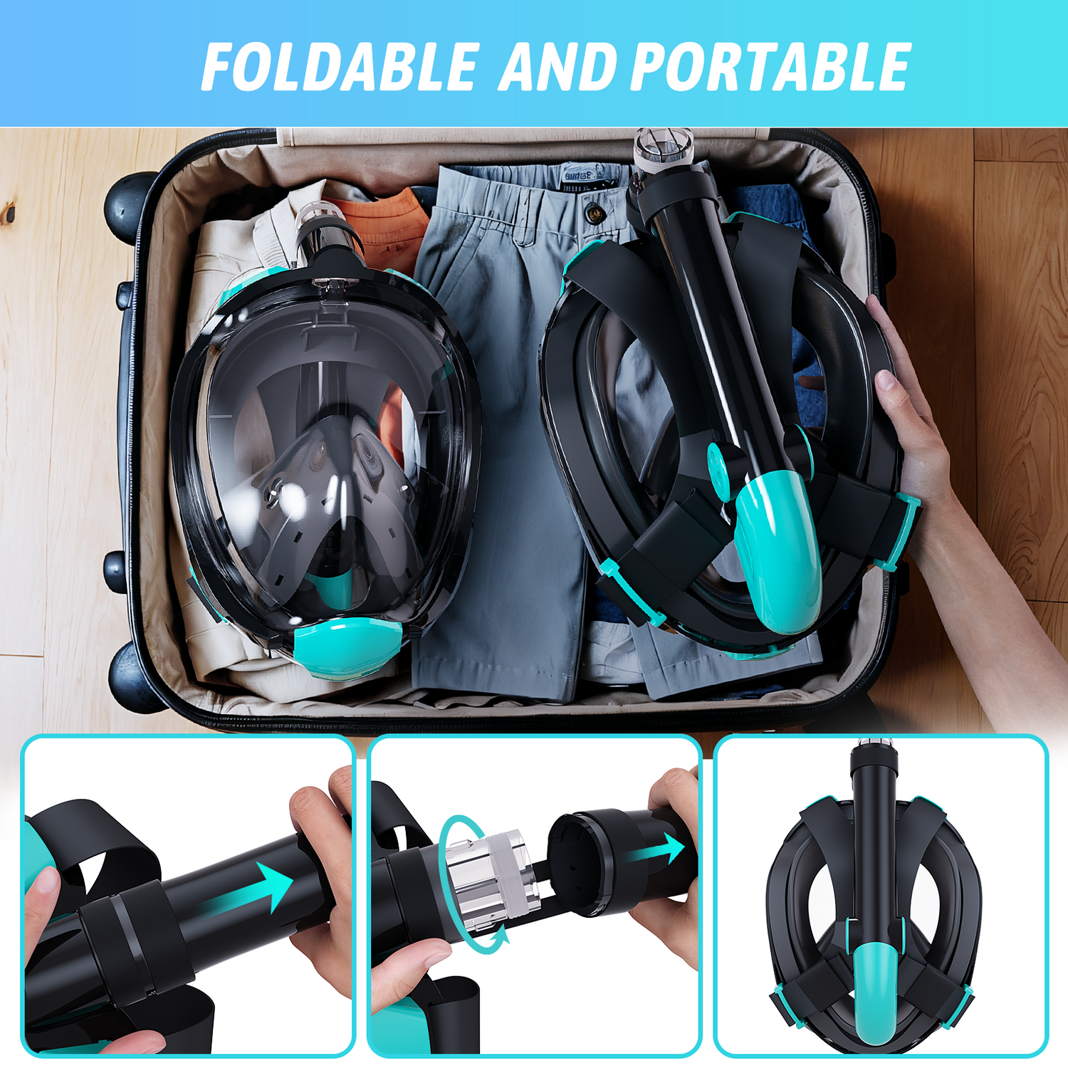 Foldable snorkel mask, easy to carry out without taking up space when traveling, assembly is very simple, a gentle twist can be installed.