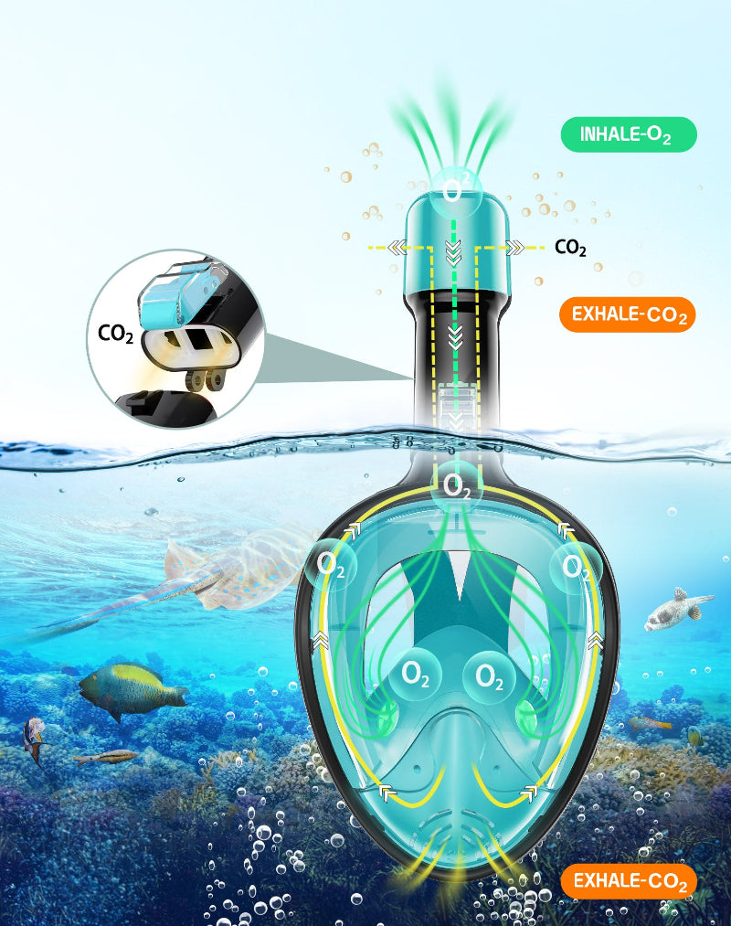 Our full face snorkel mask features clear, flat lenses that won't distort your view underwater, eliminating any dizziness or discomfort.
