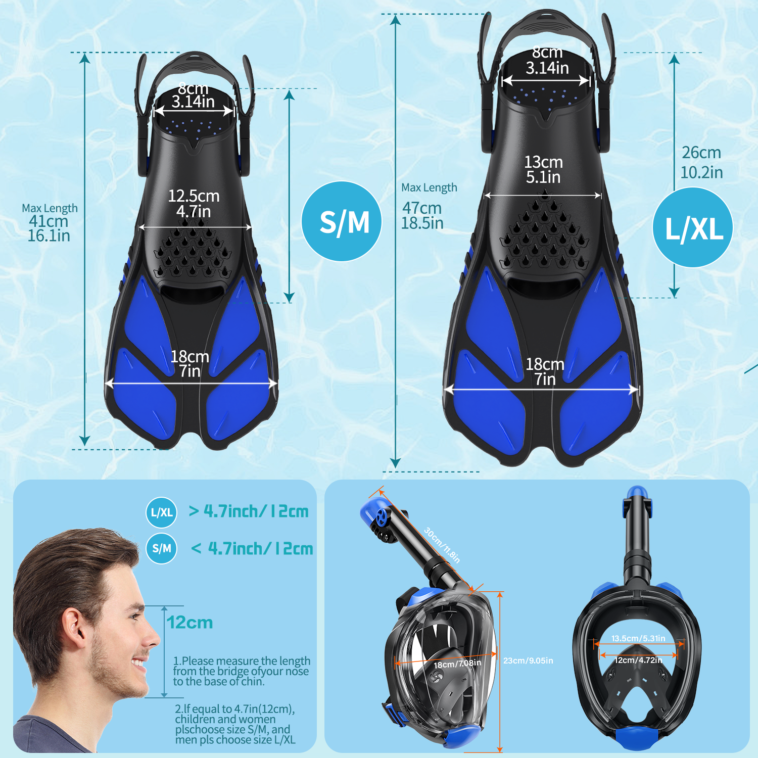Greatever Vollgesichts-Schnorchelmaske und verstellbare Schwimmflossen, Schnorchelset für Erwachsene