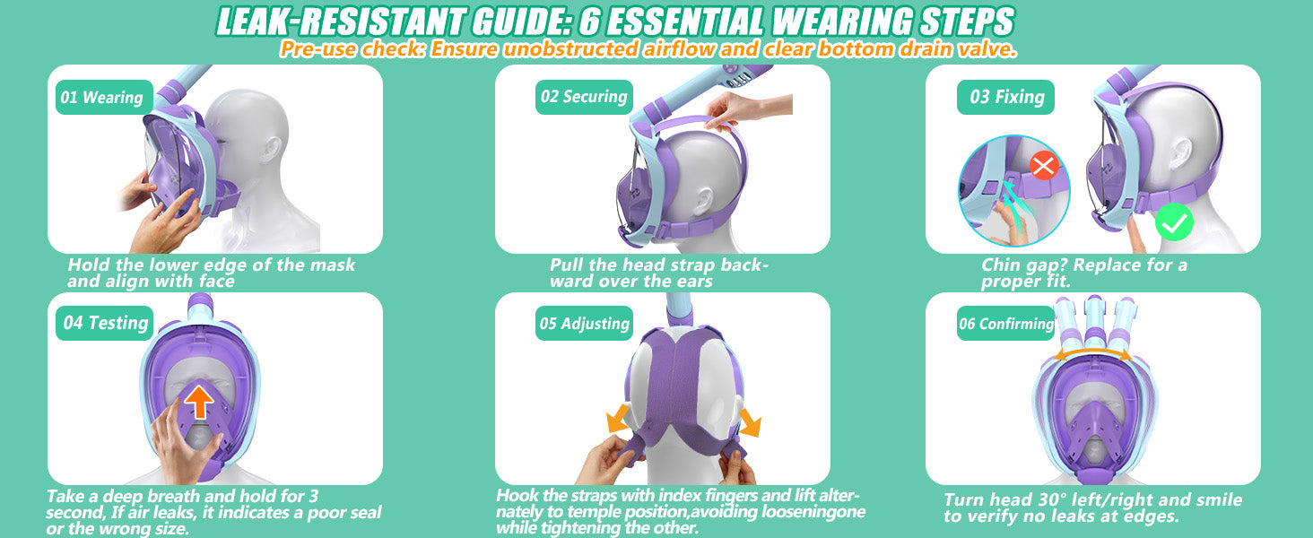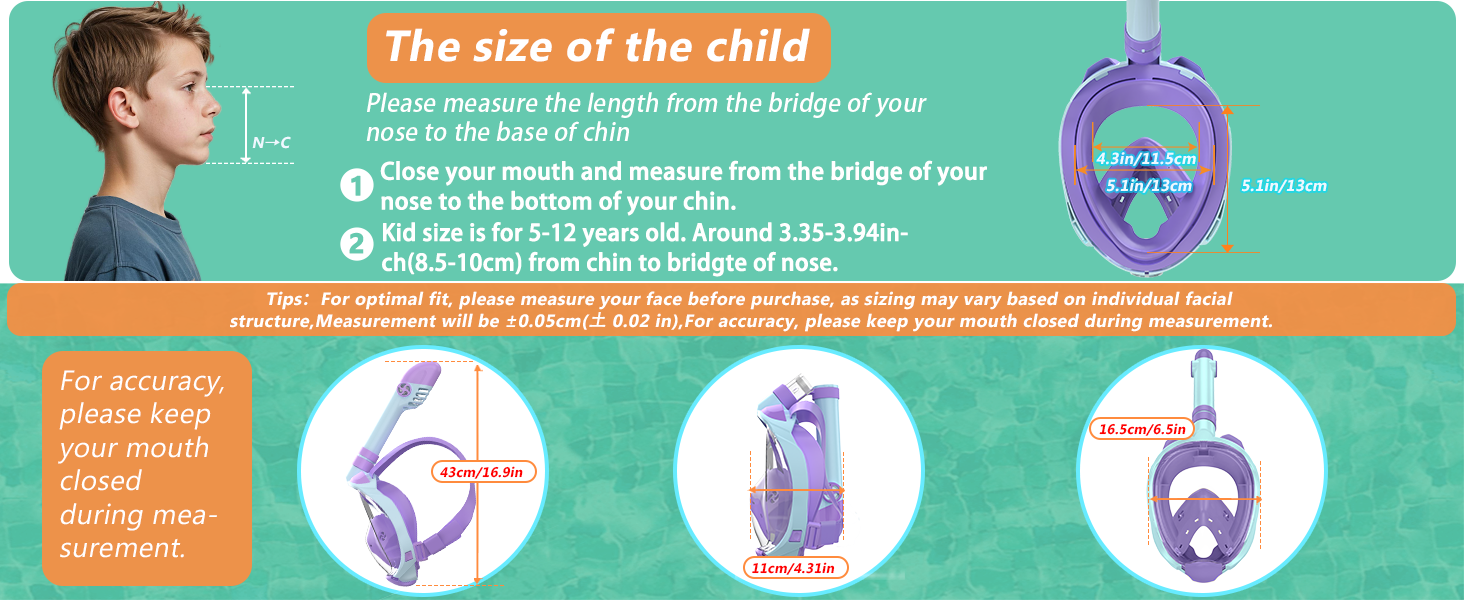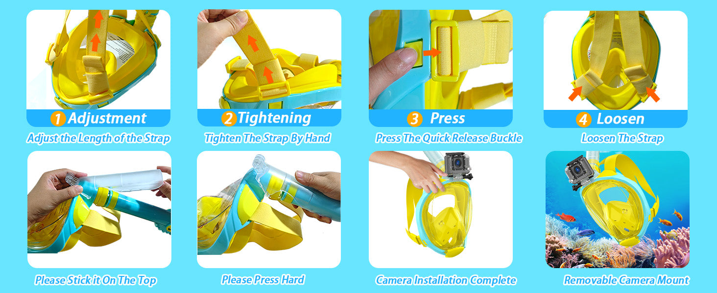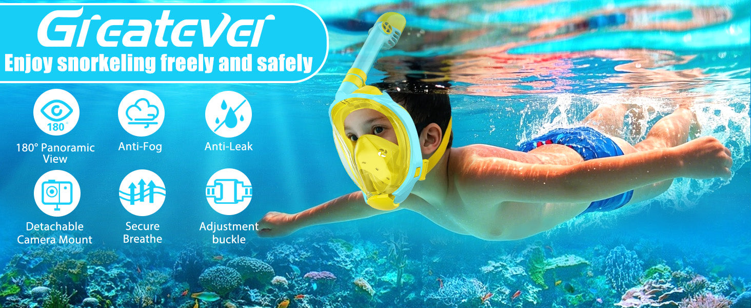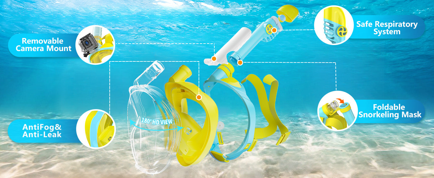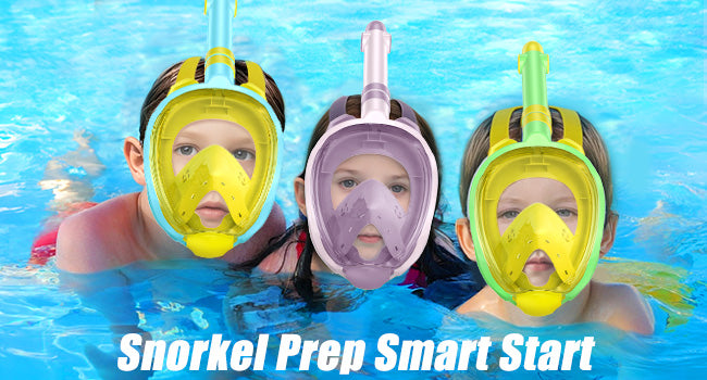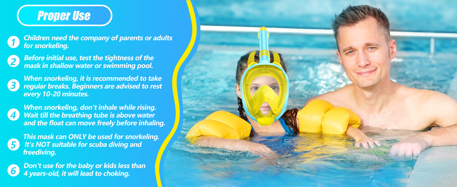 Start from shallow, adapt then deepen. Keep each snorkel 10 - 20 mins to avoid kids' tiredness or breath issues. If breathing's uncomfortable, remove the mask to breathe.