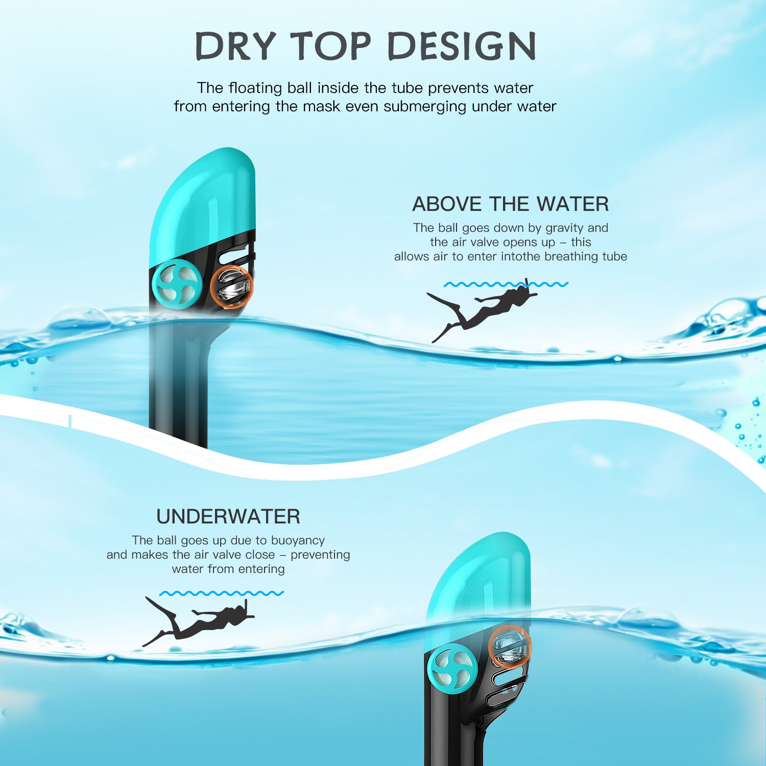Ce masque de plongée est doté d'une jupe en silicone liquide assurant une adhérence parfaite au visage et empêchant efficacement l'eau de pénétrer. Et ne craignez pas les infiltrations d'eau dans le tuba pendant la plongée : son système de flotteur à bille intégré empêche l'eau de pénétrer dans le tuba en cas d'immersion.<br/><br/>