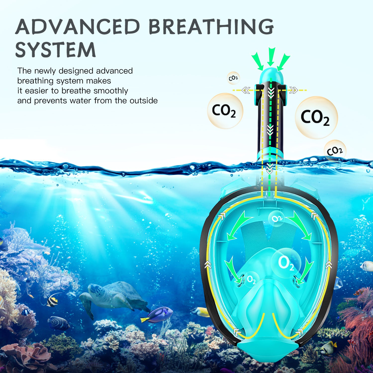 Le masque de plongée bénéficie d'une conception innovante offrant trois canaux pour créer un système respiratoire unique. Une soupape d'admission et deux sorties d'air permettent de contrôler le flux d'air et d'empêcher l'air expiré de refluer dans la chambre supérieure, ce qui a un effet antibuée.