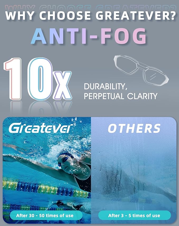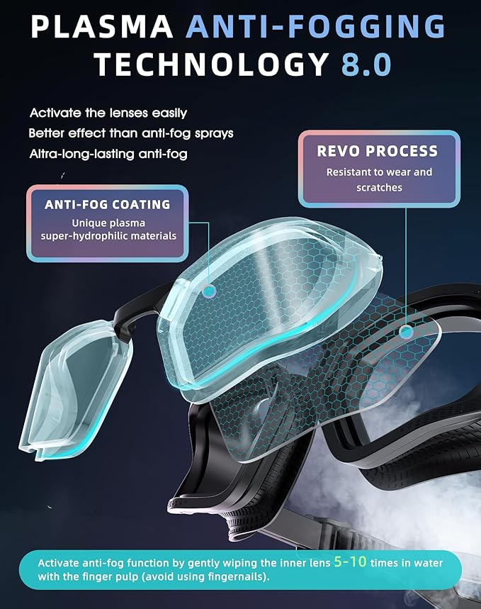 - 【Antibuée Plasma 8.0】Grâce à la technologie antibuée Plasma 8.0, nul besoin d'appliquer un antibuée. La durabilité de l'antibuée est 10 fois supérieure à celle des autres lunettes de natation pour adultes.