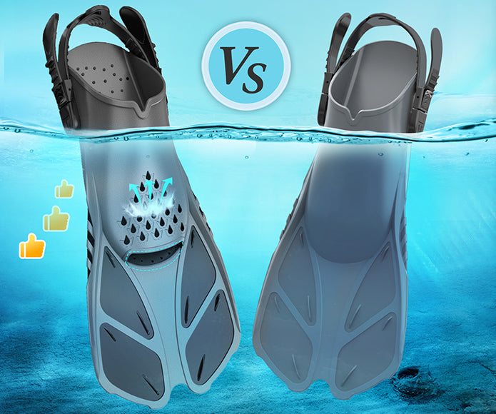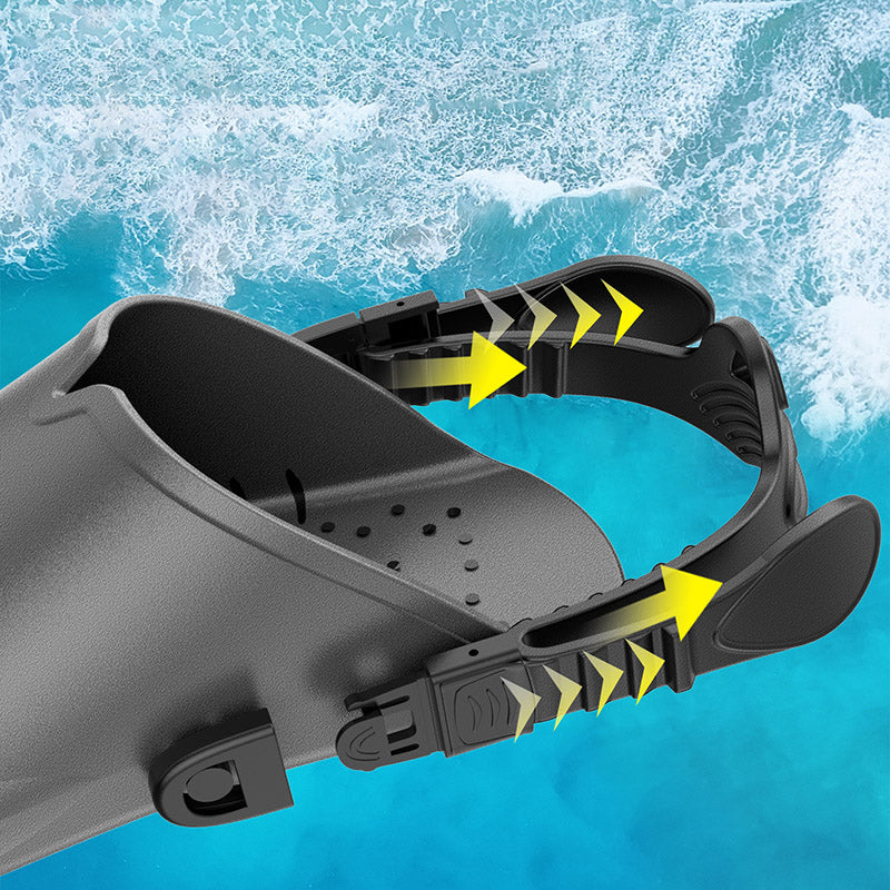Open heel design and adjustable straps make the swim fins suitable for different foot types and sizes, perfect to share with your friends and family, in addition it will let small pebbles and debris fall. The important part is the quick release buckle that keeps strap's length of the you have set, so you don't need to adjust the straps for every use, easy donning and doffing.