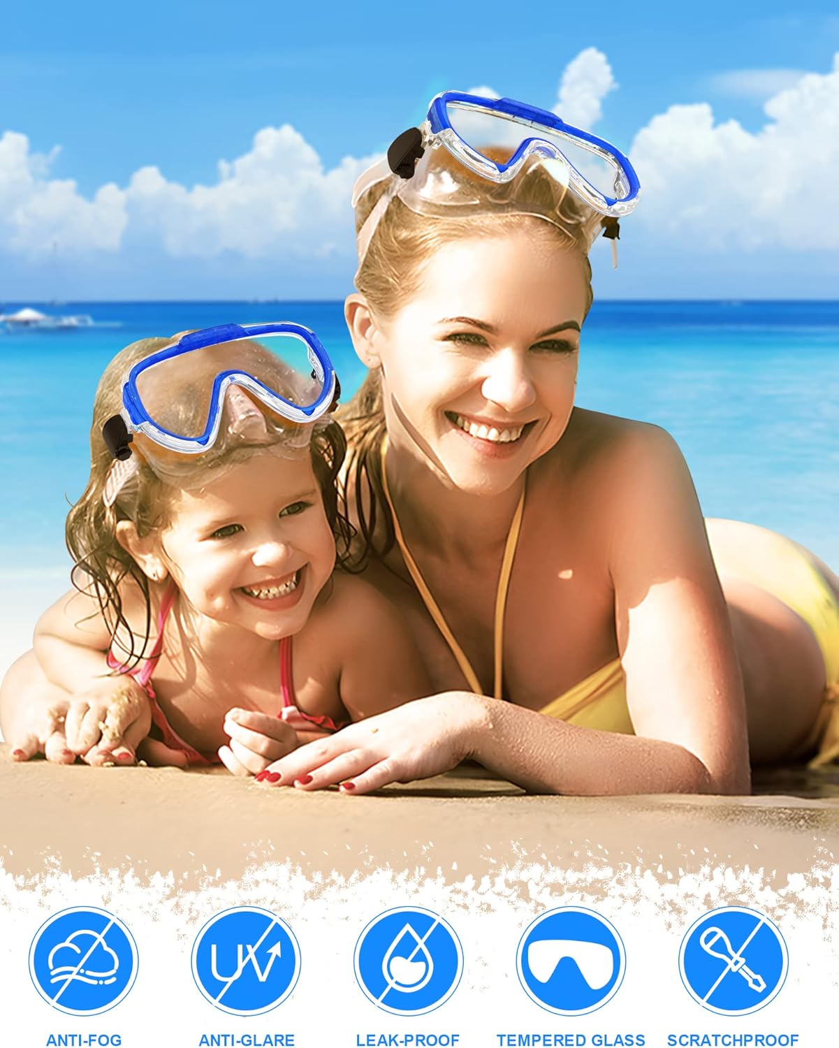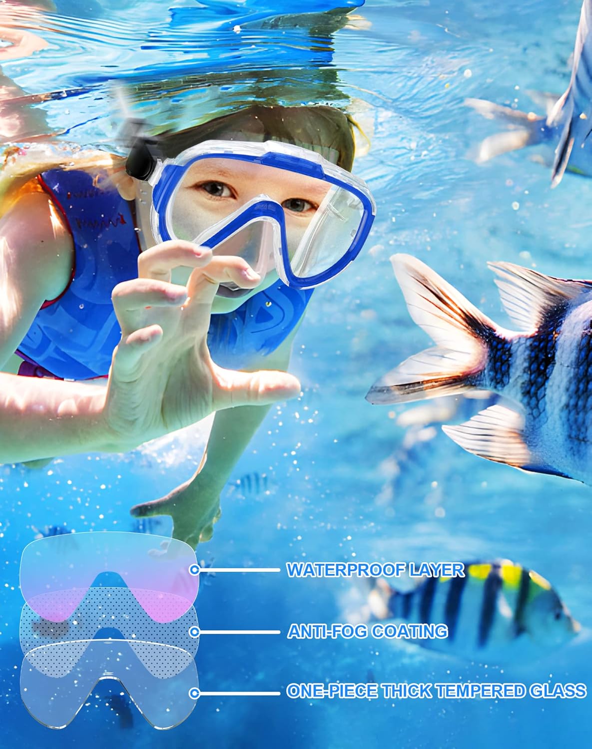 Tempered glass lenses + anti fog coating, the snorkel goggles give you a cystal view. There is no obstruction between eyes with the single window design. Tempered glass lens offers greater protection for eyes.